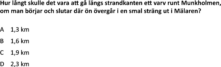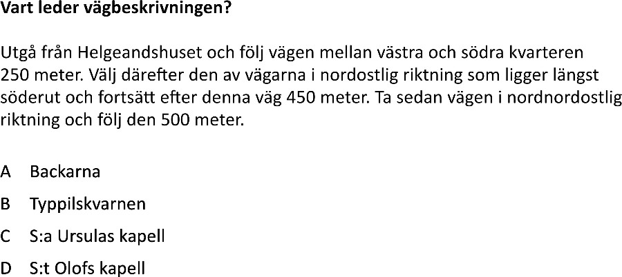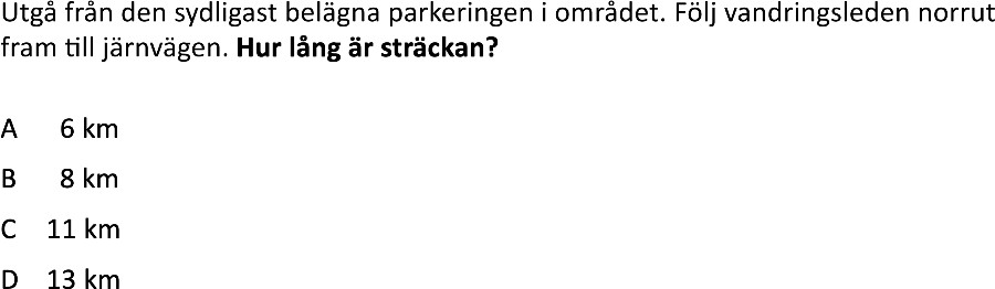 Vägbeskrivningsuppgifter är en typ av problem där deltagarna använder en karta för att lösa frågor om avstånd, riktning, och områden. Dessa uppgifter kräver inte bara grundläggande matematiska färdigheter utan också förmågan att läsa och tolka kartor korrekt. Deltagarna måste också applicera rumsförståelse och skalningskunskaper.